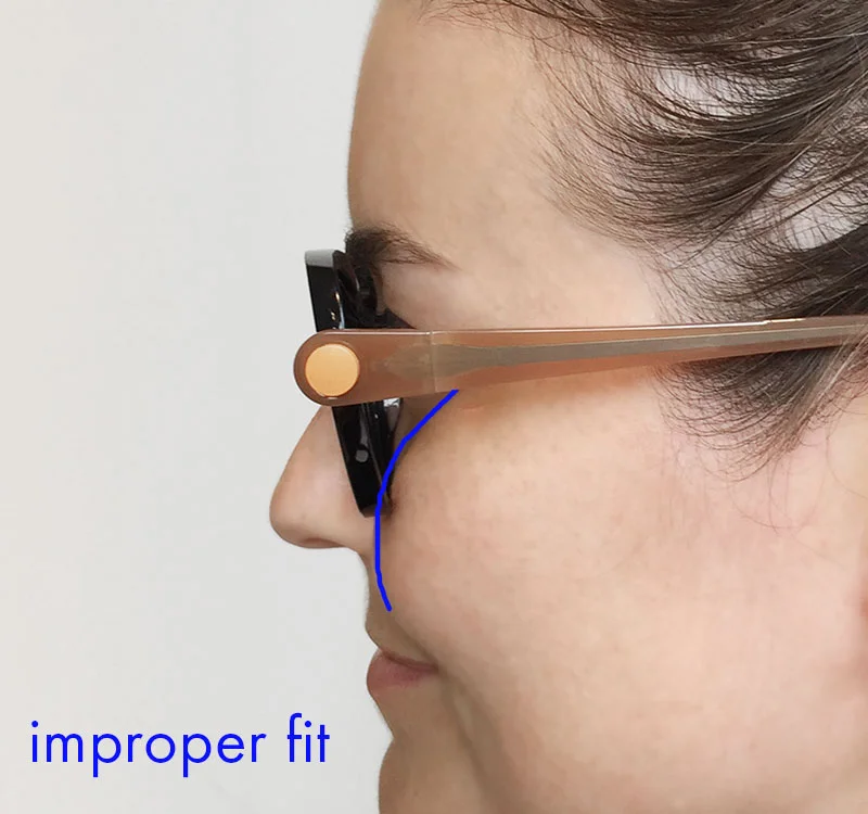 The bridge of your glasses or its nose pads should rest easily on your nose without any feeling of compression or tightness. Your glasses can weigh heavy on your face all day and leave tender spots with an improper fit out of the gates. Temple Size is the measurement of the arms of the.